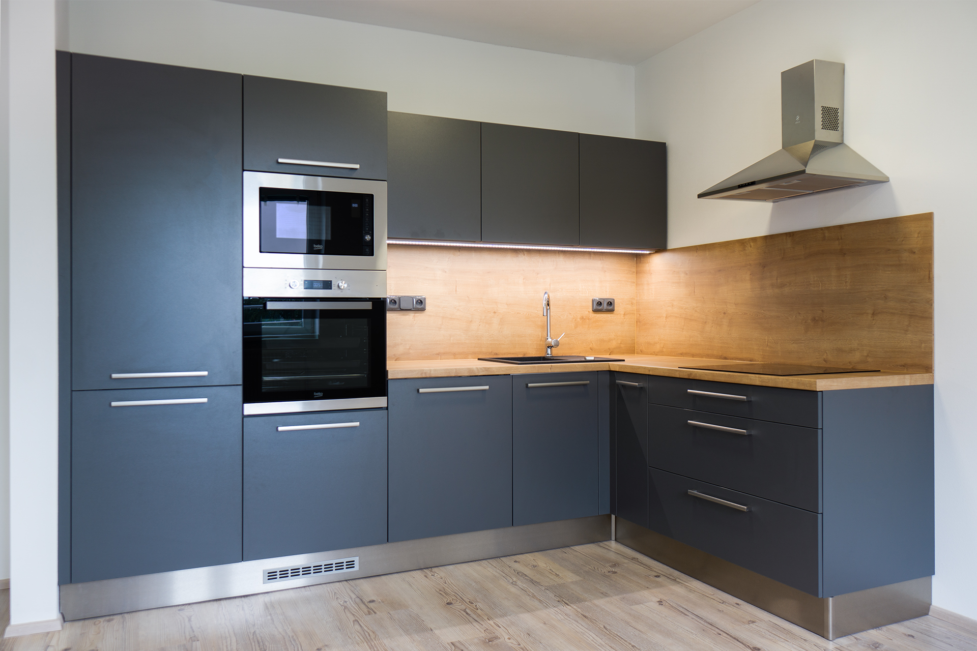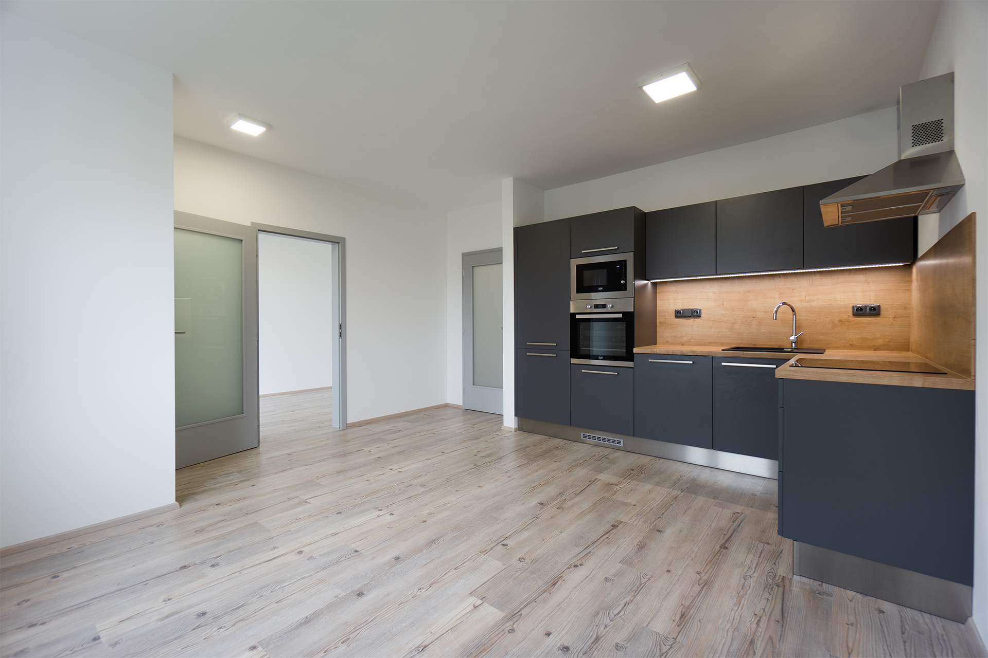 Obývací pokoj s kuchyní má výměru 20 m2 a je vybavený kvalitní a stylovou kuchyňskou linkou s veškerými spotřebiči. Z ložnice o velikosti 10,5 m2 se dostanete přímo na částečně krytý balkon s výhledem do okolní zeleně. Vedle ložnice se nachází komora, kterou můžete využít třeba jako šatnu. Do koupelny se vstupuje z chodby a najdete v ní prostornou vanu se skleněnou zástěnou, umyvadlo a toaletu.