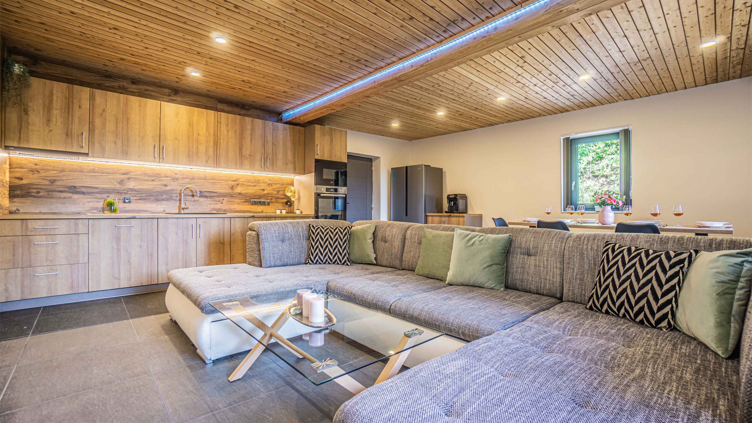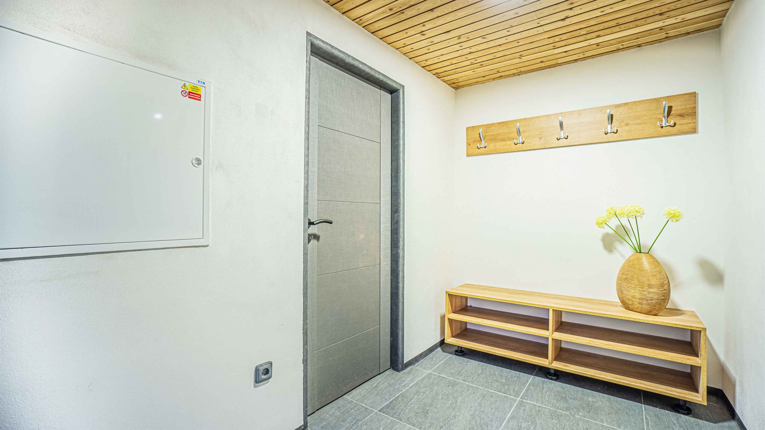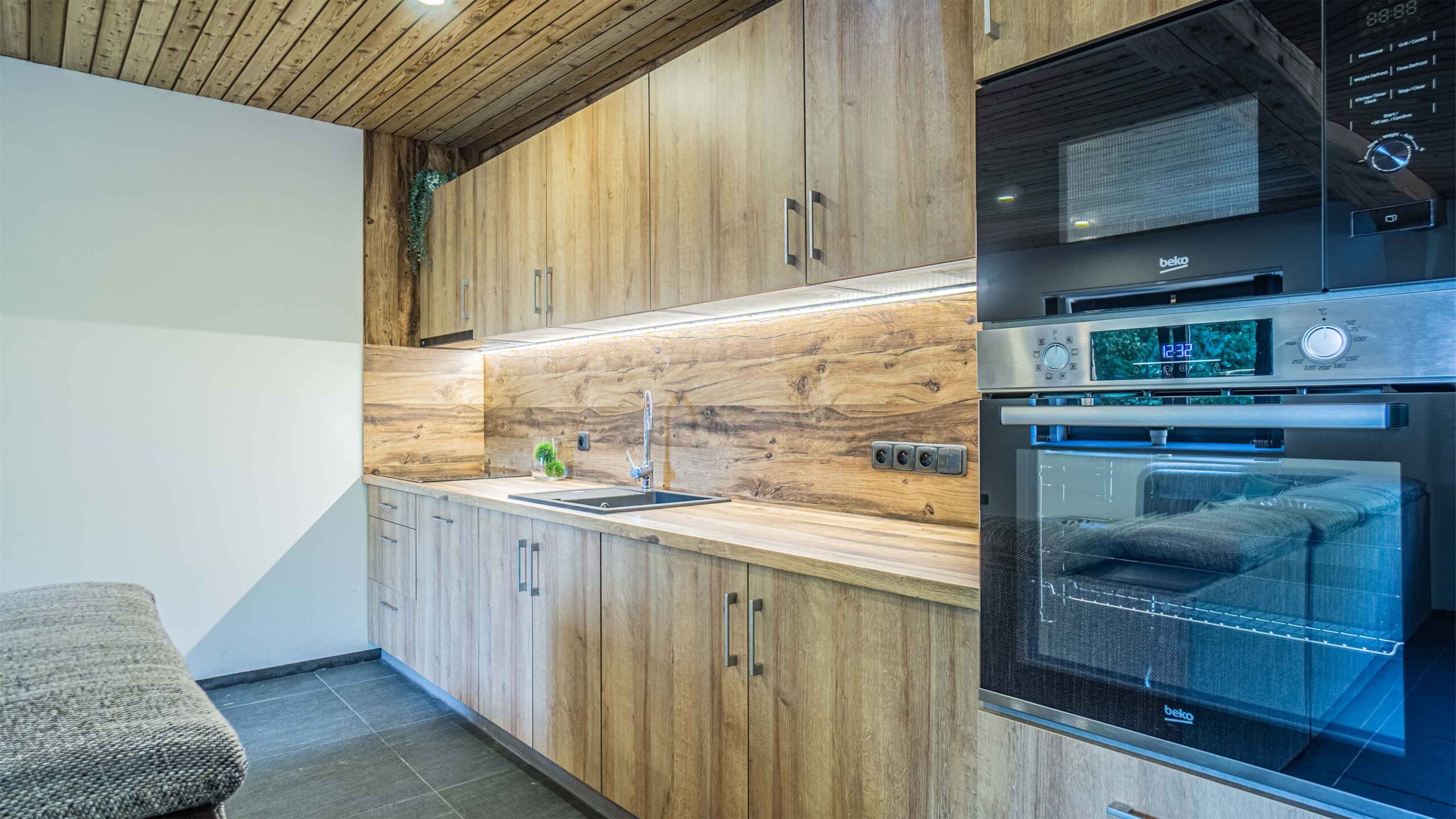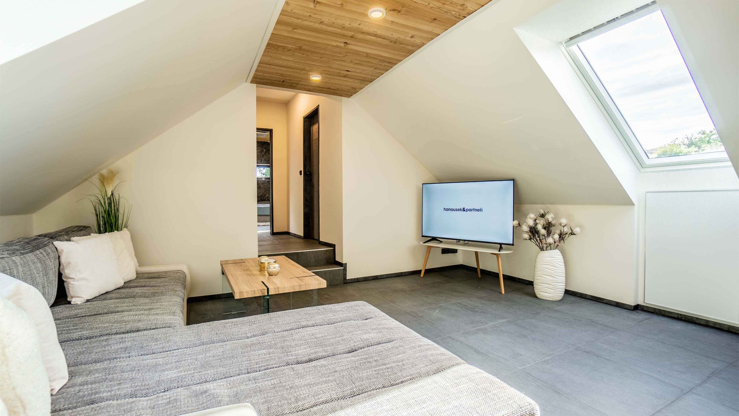 V prvním patře se nachází obývák s kuchyní a jídelním koutem. Kuchyňská linka ve stylovém dřevěném dekoru je vybavená všemi spotřebiči a v obývací části nechybí ani velká sedací souprava, na kterou se poskládá celá parta. Kromě toho je tu ložnice s postelí, koupelna s vanou a sprchovým koutem i samostatná toaleta s technickým zázemím.