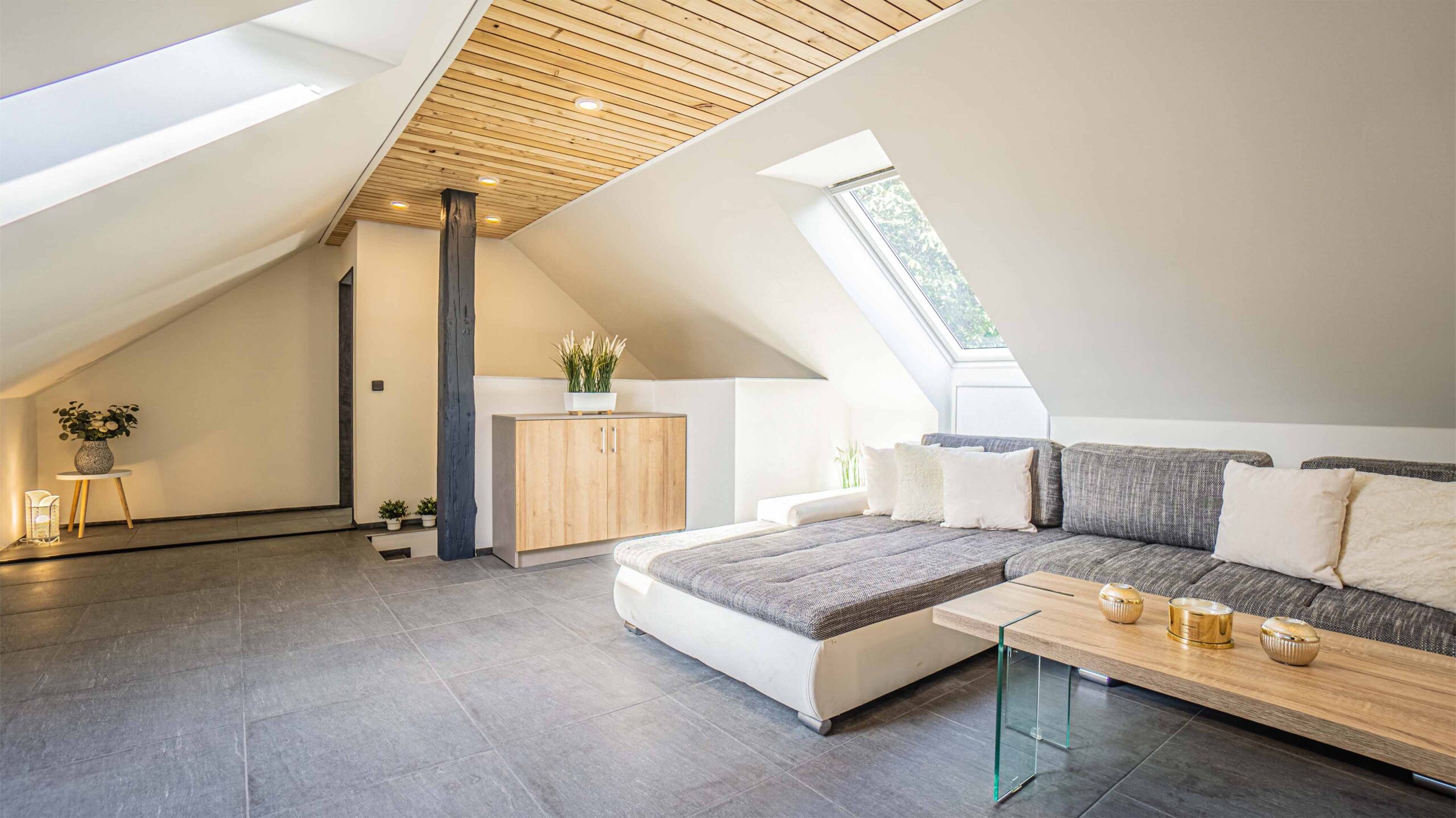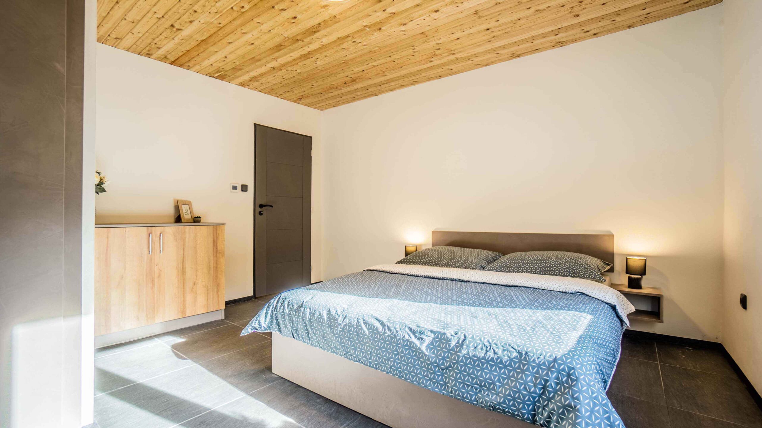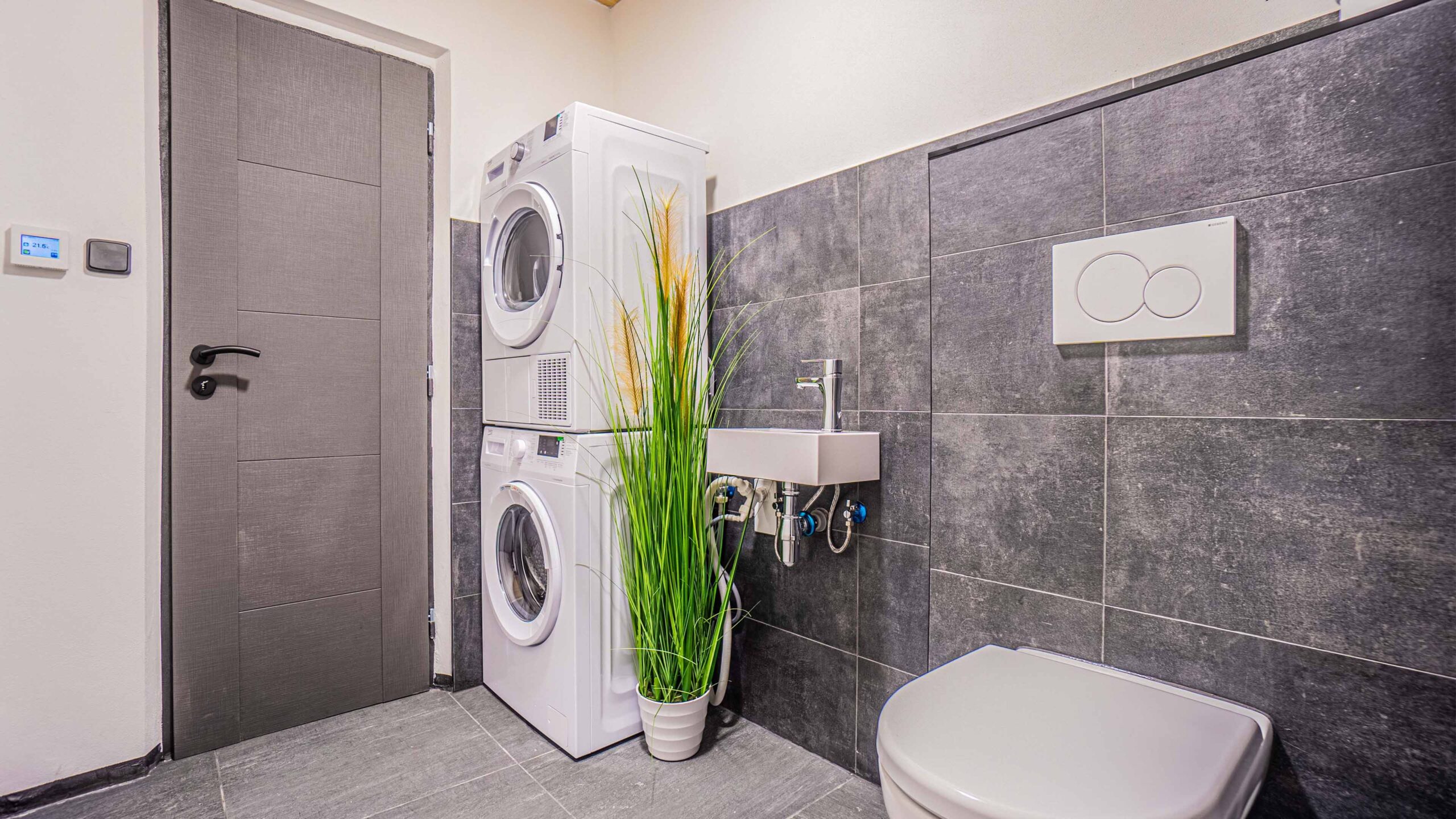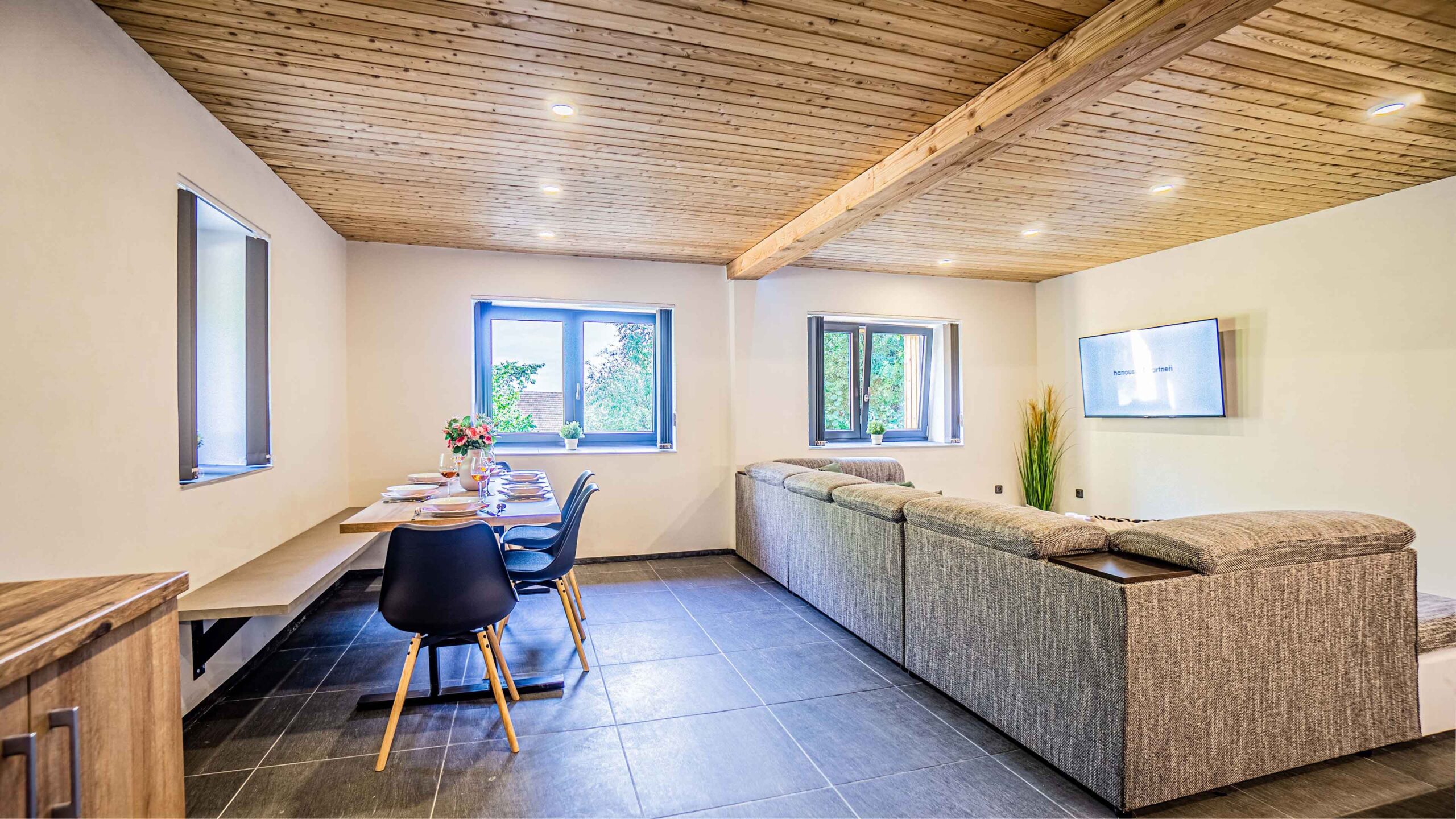 V prvním patře se nachází obývák s kuchyní a jídelním koutem. Kuchyňská linka ve stylovém dřevěném dekoru je vybavená všemi spotřebiči a v obývací části nechybí ani velká sedací souprava, na kterou se poskládá celá parta. Kromě toho je tu ložnice s postelí, koupelna s vanou a sprchovým koutem i samostatná toaleta s technickým zázemím.