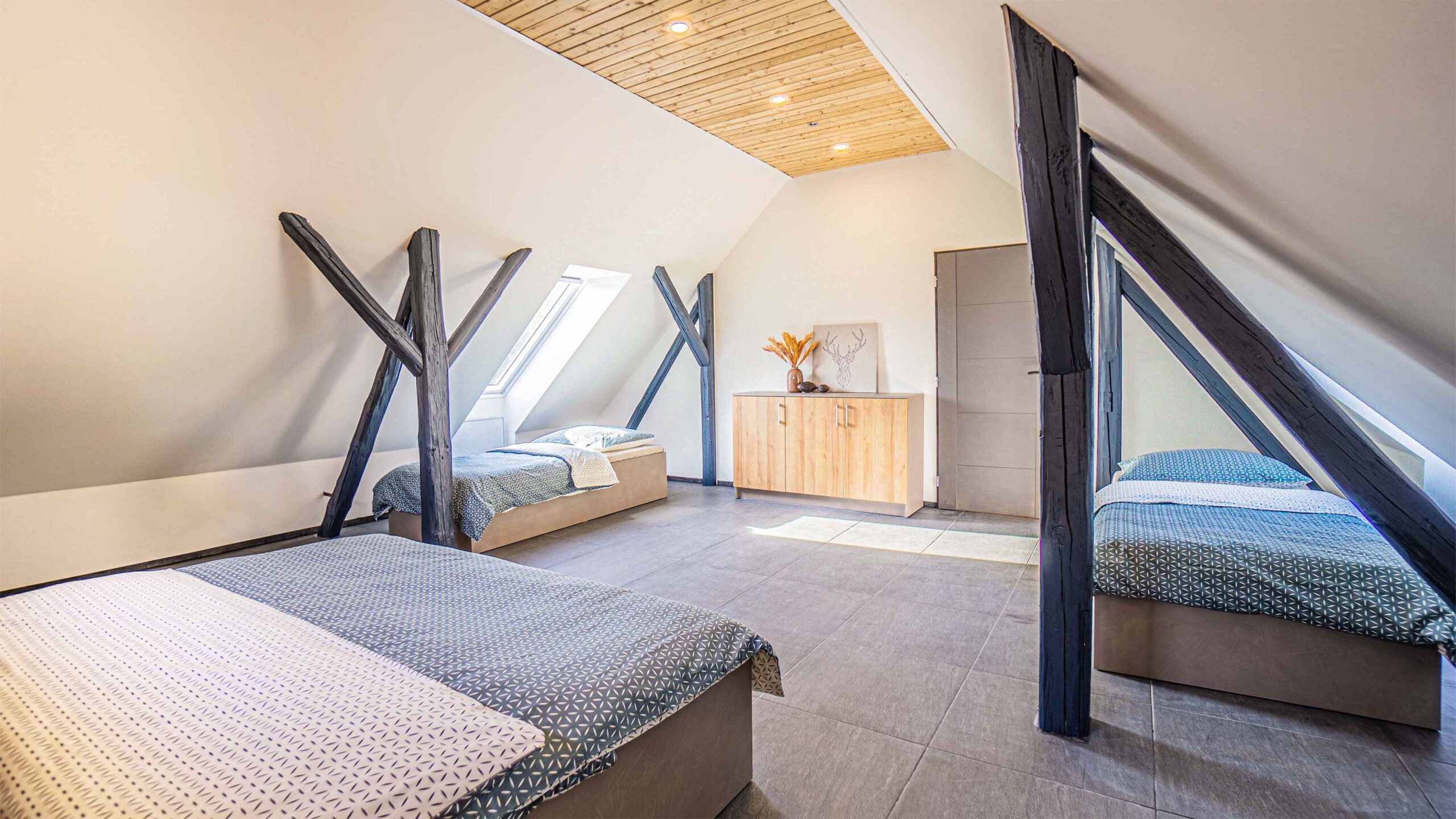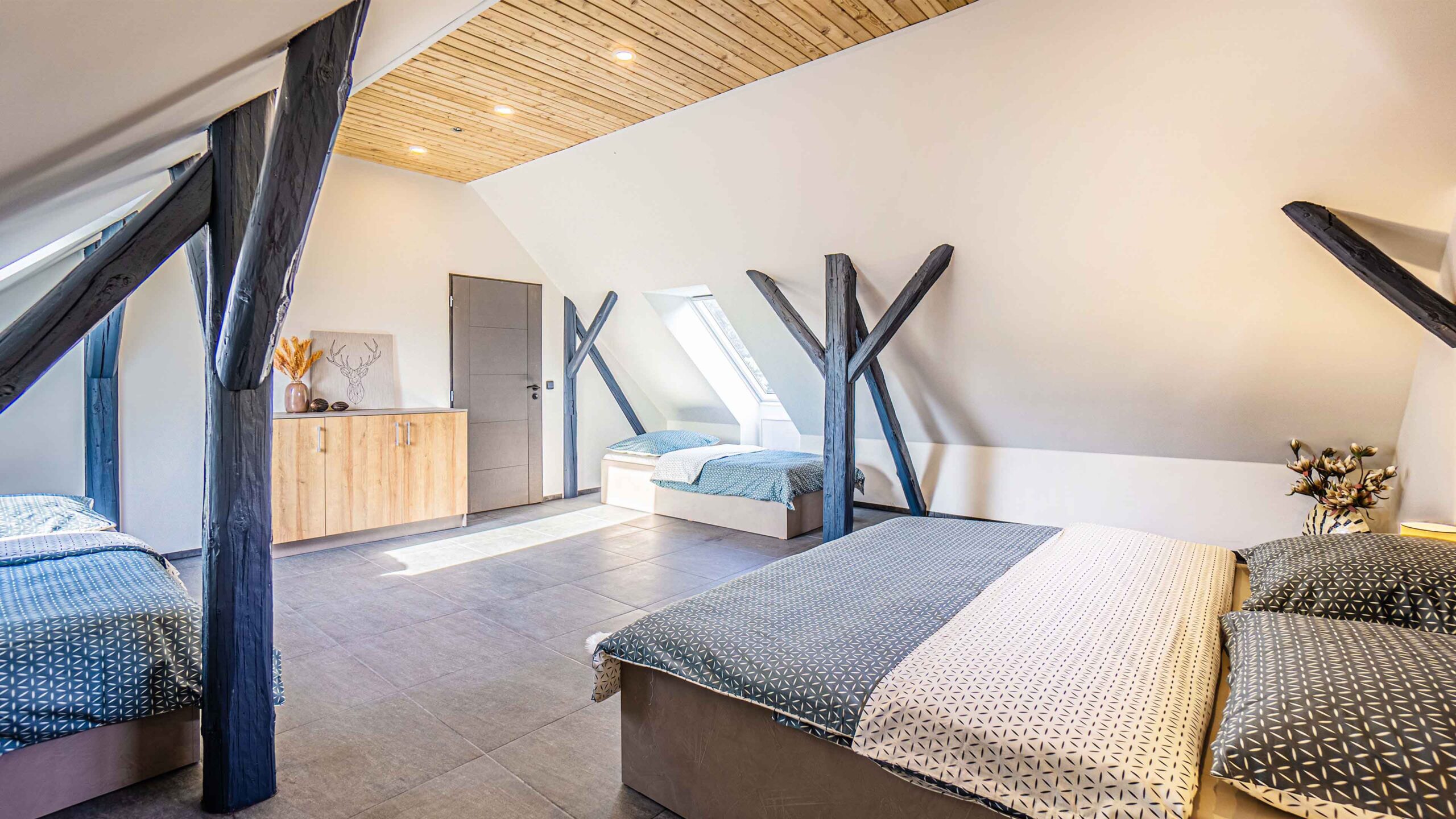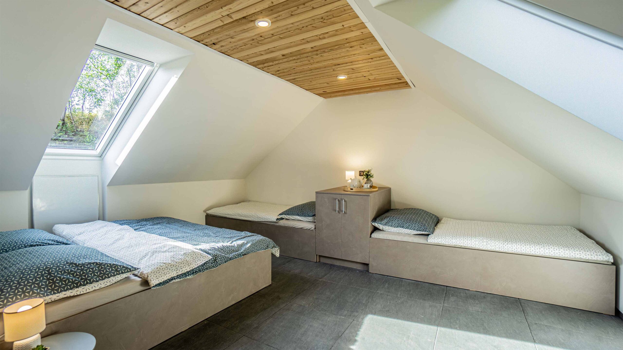Z chodby po schodech nahoru vystoupáte do druhého patra, kde na vás čekají další dvě ložnice pro tři osoby a společenská místnost s posezením. Na patře je také další koupelna s WC.