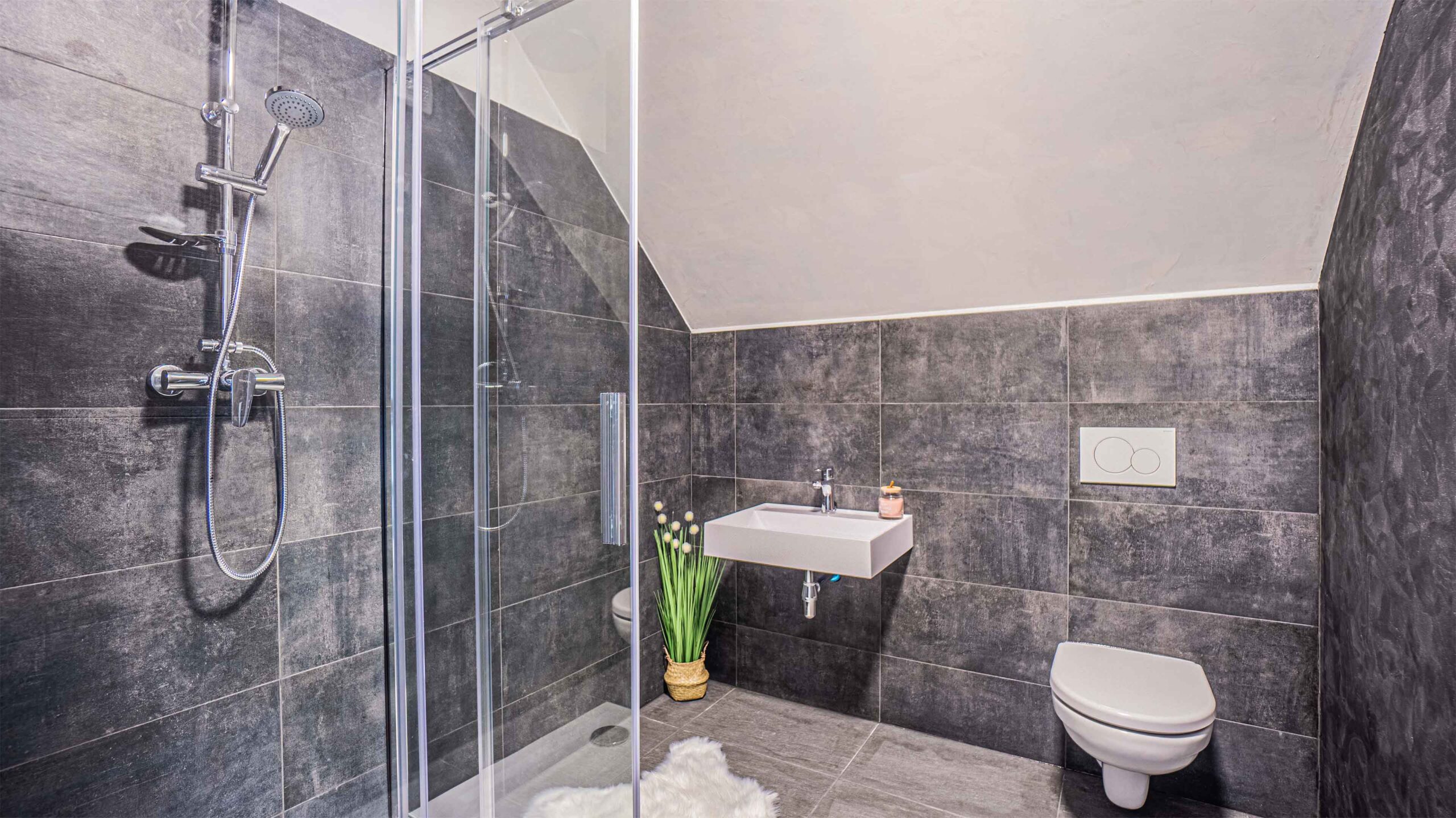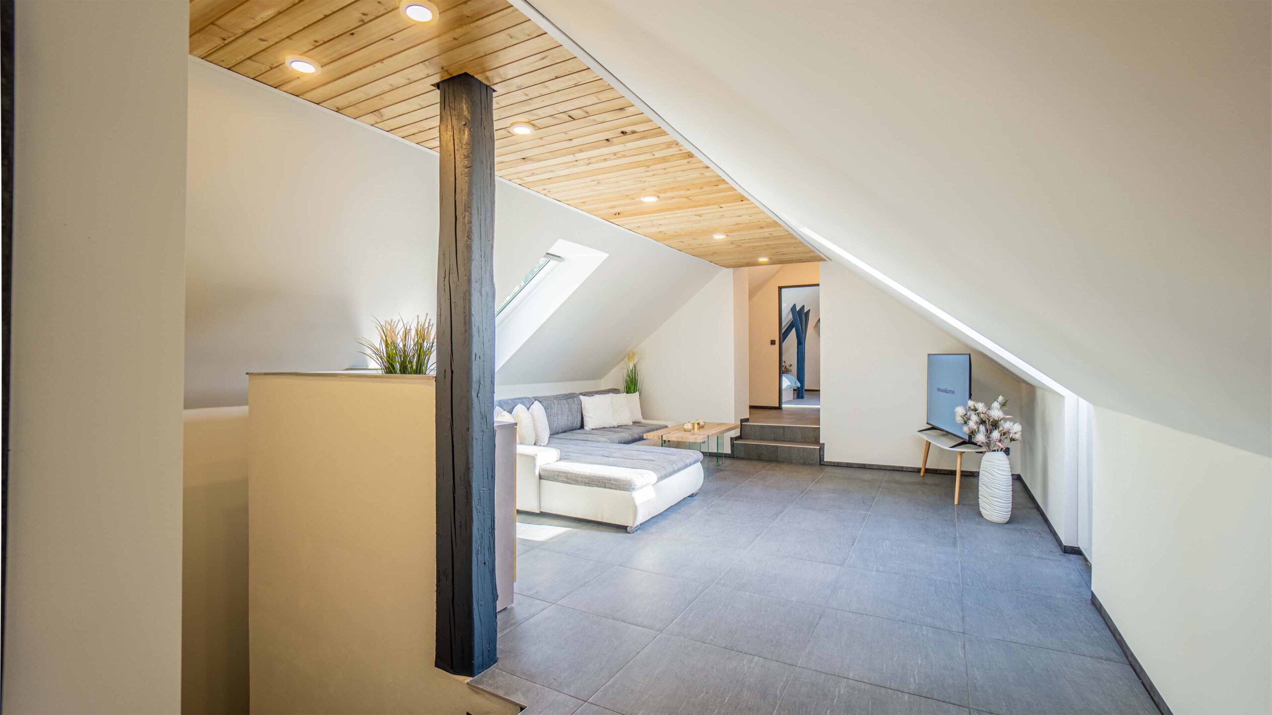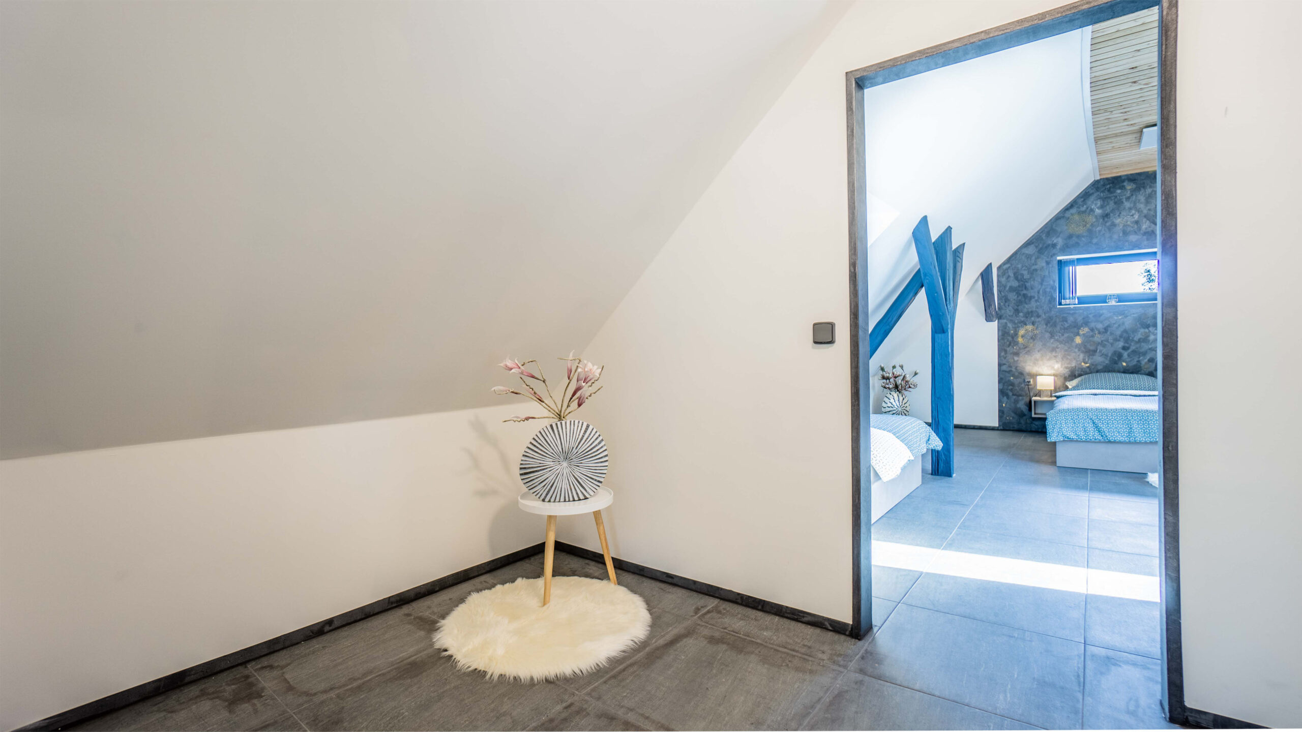 Z chodby po schodech nahoru vystoupáte do druhého patra, kde na vás čekají další dvě ložnice pro tři osoby a společenská místnost s posezením. Na patře je také další koupelna s WC.