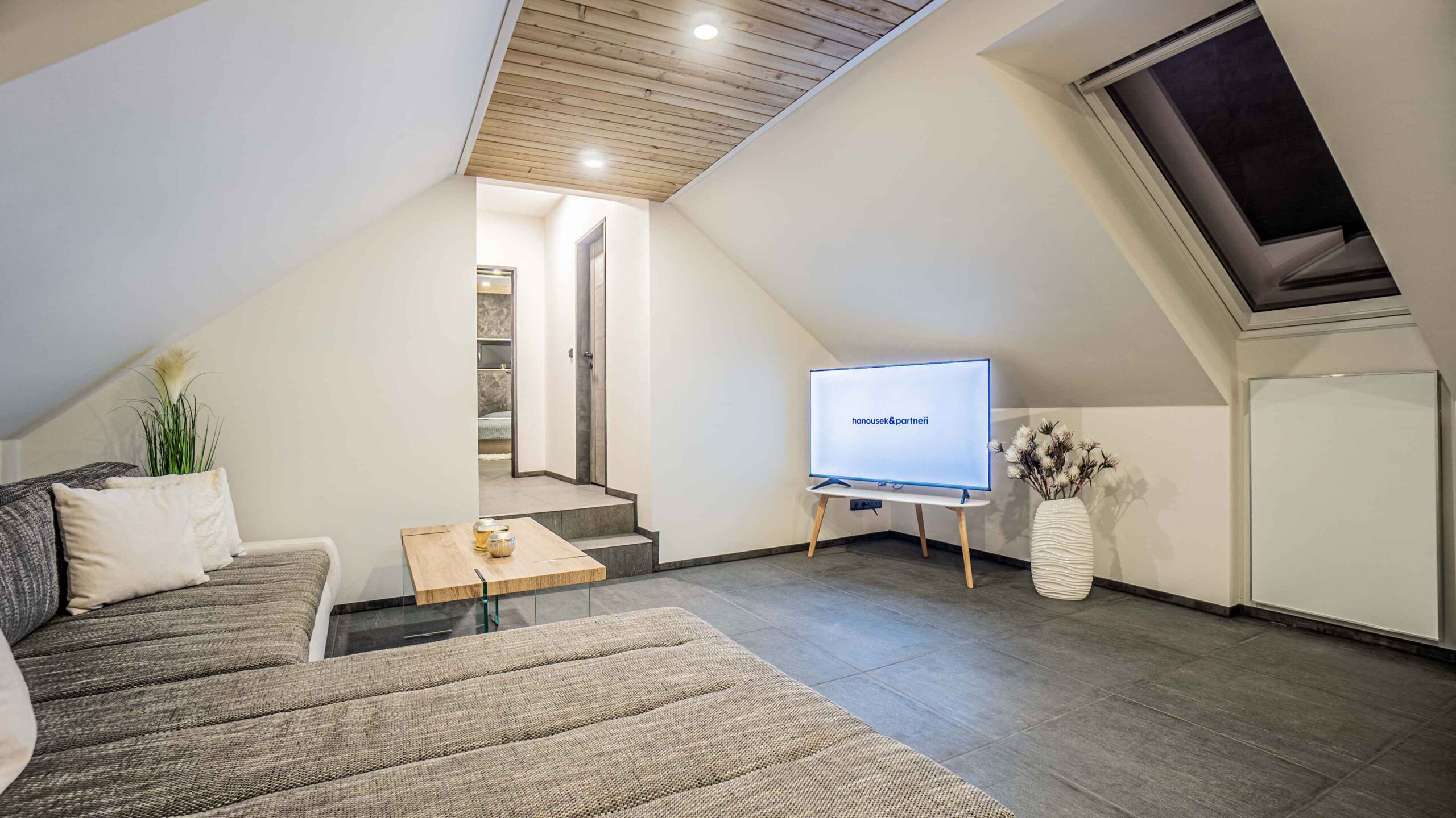 Dům se prodává kompletně zařízený a jeho aktuální kapacita je 10 lůžek. Součástí domu je také zařízené wellness s vířivkou a saunou s vyhřívanými lavicemi. A nechybí tu ani stodola s výměrou necelých 25 m2, kde si můžete s přáteli večer dát třeba partičku pokeru. Pod domem je také sklep, do kterého se dostanete z koupelny v prvním patře.