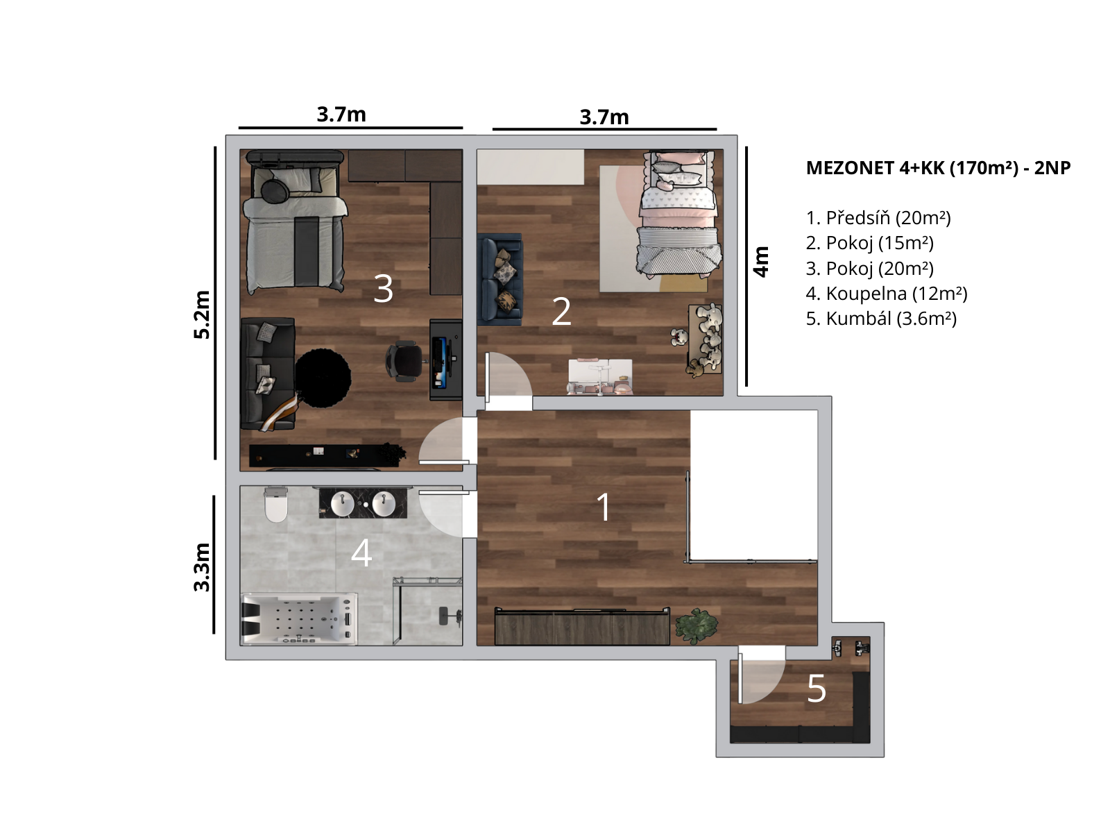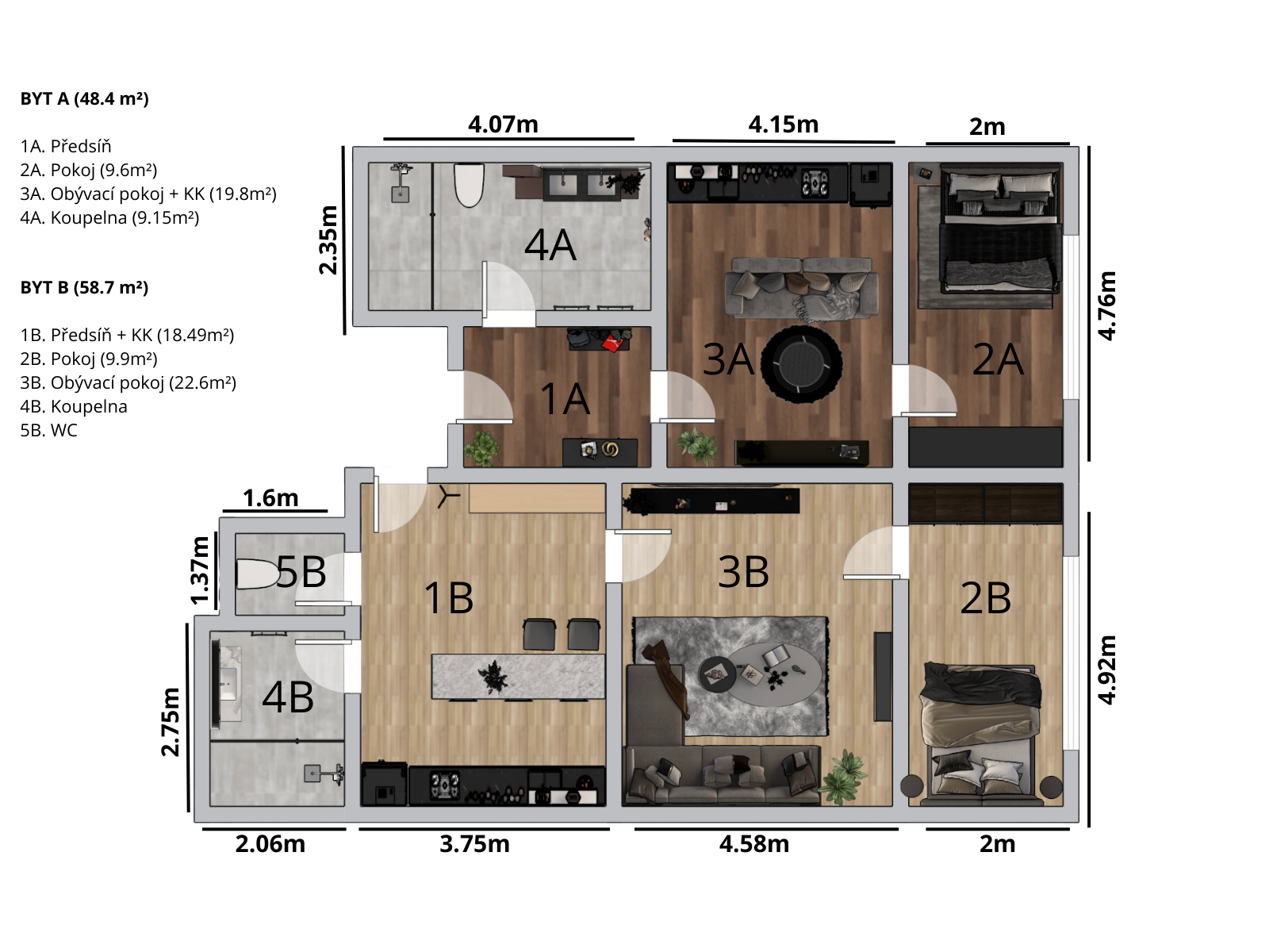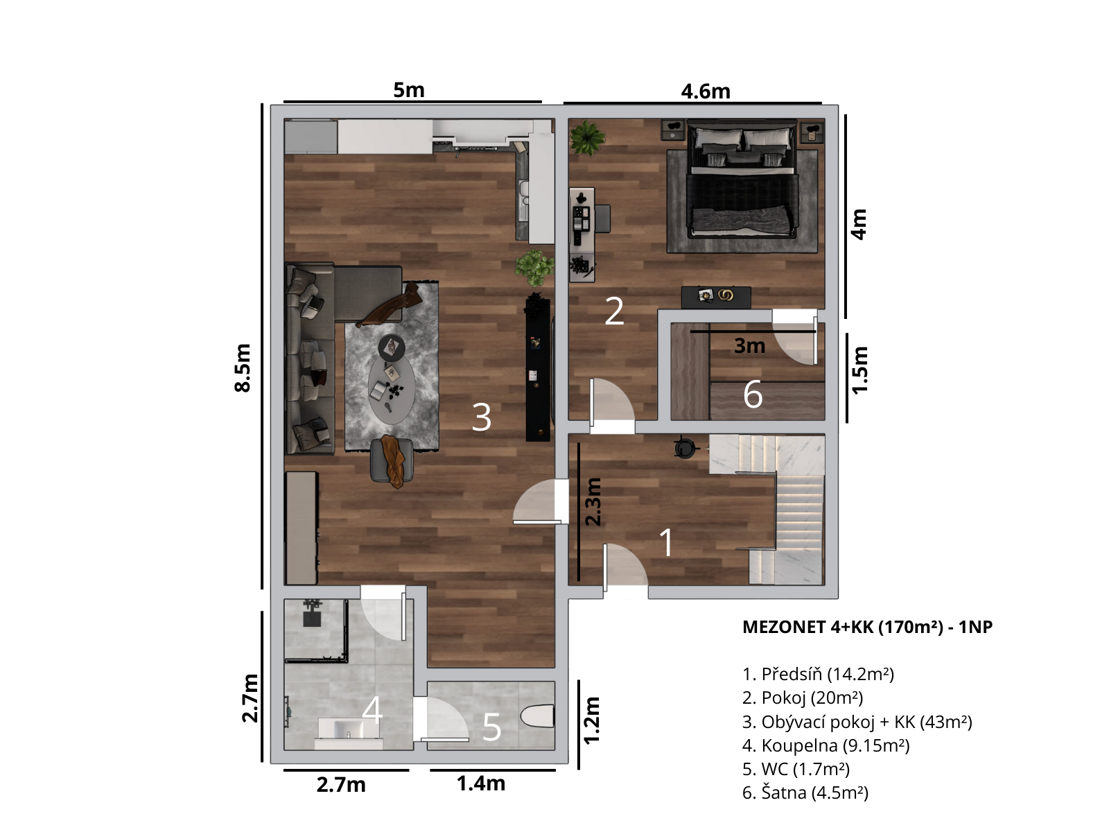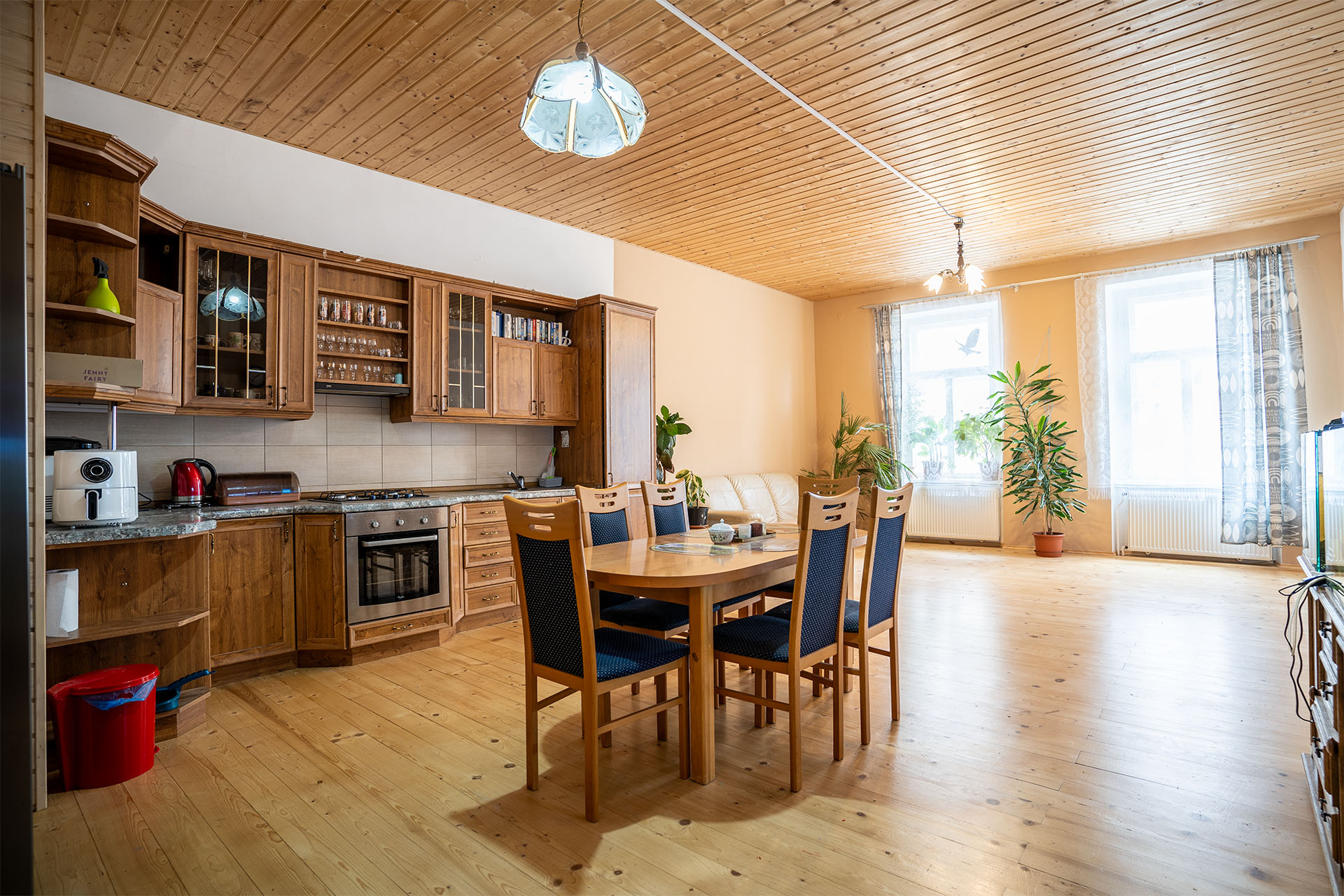 V současnosti se v 1. NP nacházejí dvě bytové jednotky – prostorný byt 2+1 (107 m²) a mezonet 4+kk (170 m²). Lze je jednoduše rozdělit na čtyři samostatné byty o dispozici 2+kk. Půdní prostor navíc nabízí možnost vybudování další bytové jednotky 2+kk se vstupem z chodby ze společných prostor. Celkově tak může v domě vzniknout až pět bytových jednotek, což výrazně zvyšuje atraktivitu a investiční potenciál celé nemovitosti.
