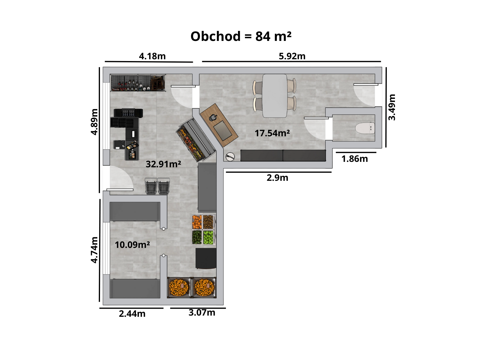 V přízemí se nachází dva komerční prostory – obchodní jednotka o výměře 84 m² a skladovací prostor 36 m². Oba jsou dlouhodobě pronajaty stabilním nájemcům a generují pravidelný příjem již od prvního dne.