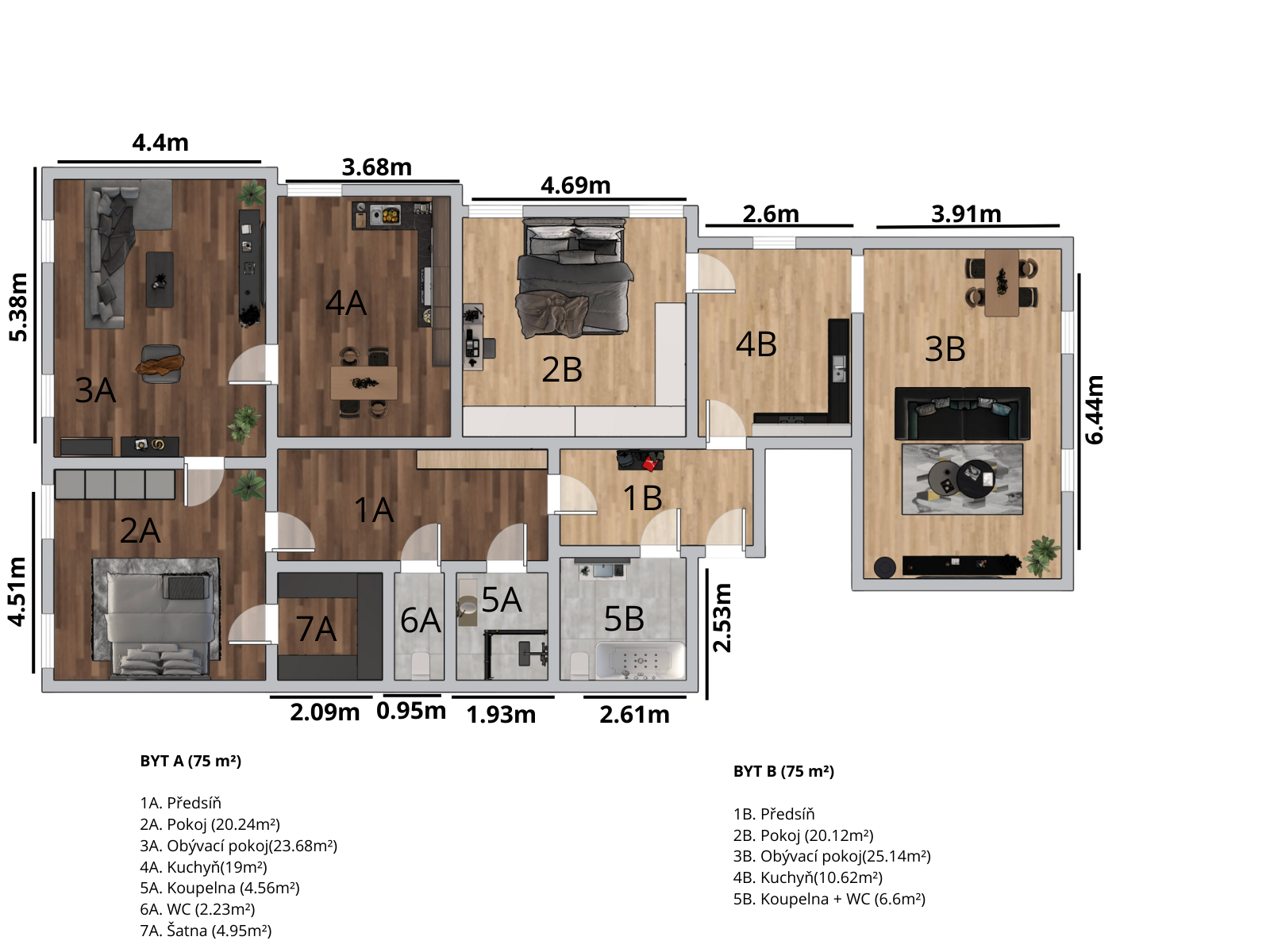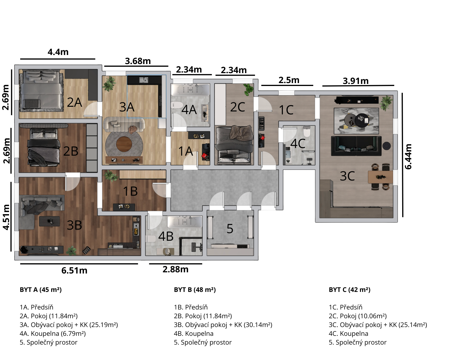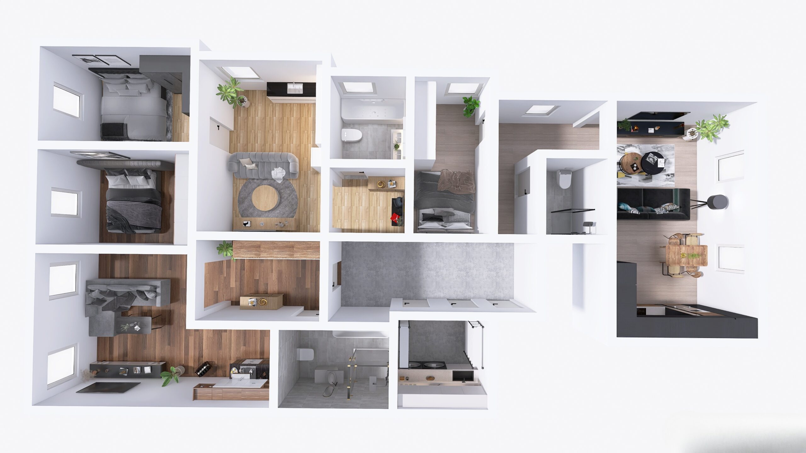 První patro nabízí dvě bytové jednotky o celkové ploše 157 m². Díky chytrému dispozičnímu řešení je možné prostor rozdělit až na tři samostatné byty 2+kk, což je dnes nejžádanější a nejprodávanější typ bytových jednotek na trhu. Velkorysý půdní prostor navíc umožňuje vybudování dalších tří bytů 2+kk. Celkem tak může vzniknout až šest bytů této dispozice v kombinaci s obchodními prostory v přízemí. Dispozice 2+kk jsou nejoblíbenější a nejprodávanější jednotkou – ideální pro stabilní výnos.